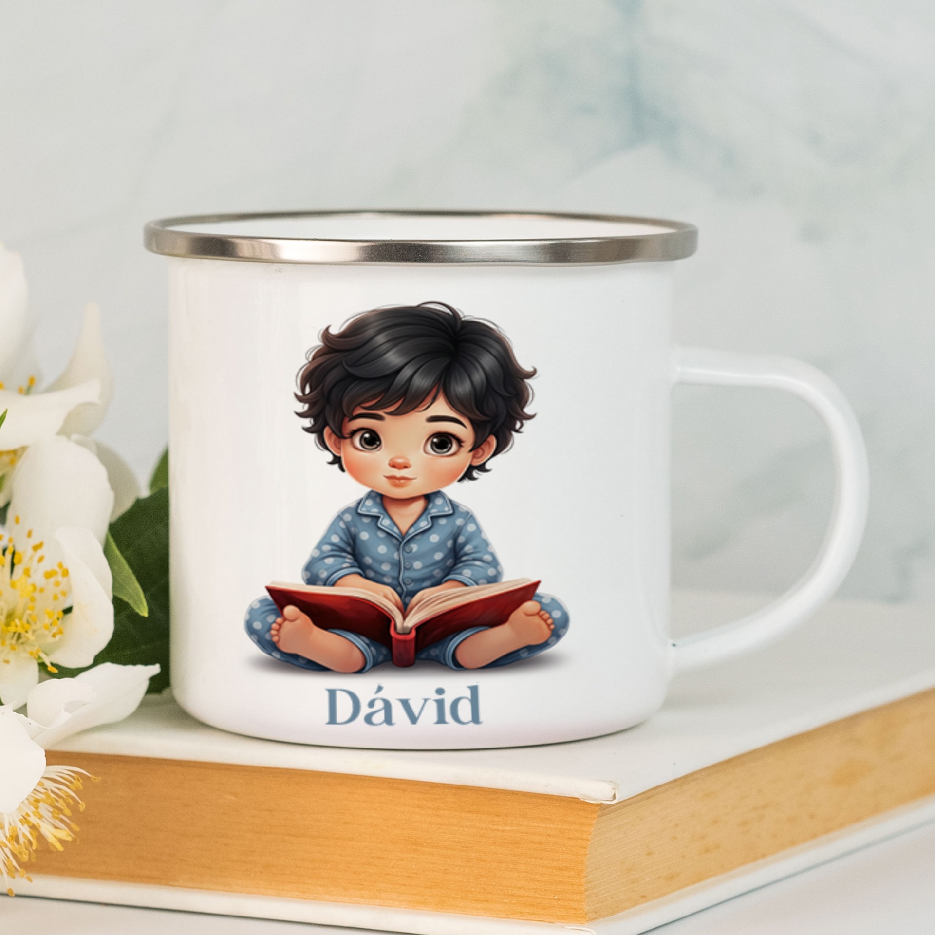 Biely smaltovaný kovový hrnček so strieborným lemom