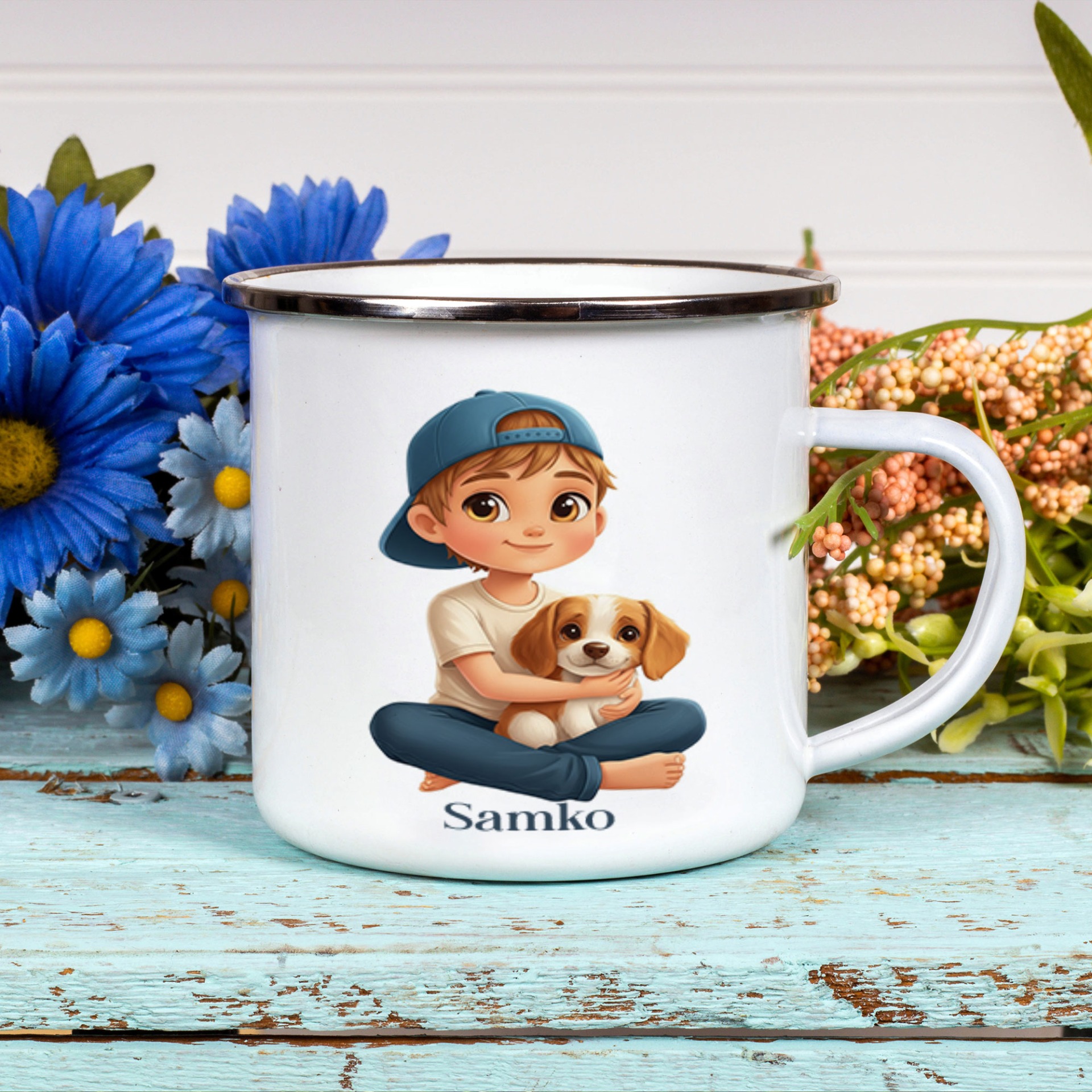 CHLAPEC SO PSOM smaltovaný hrnček s ľubovoľným menom