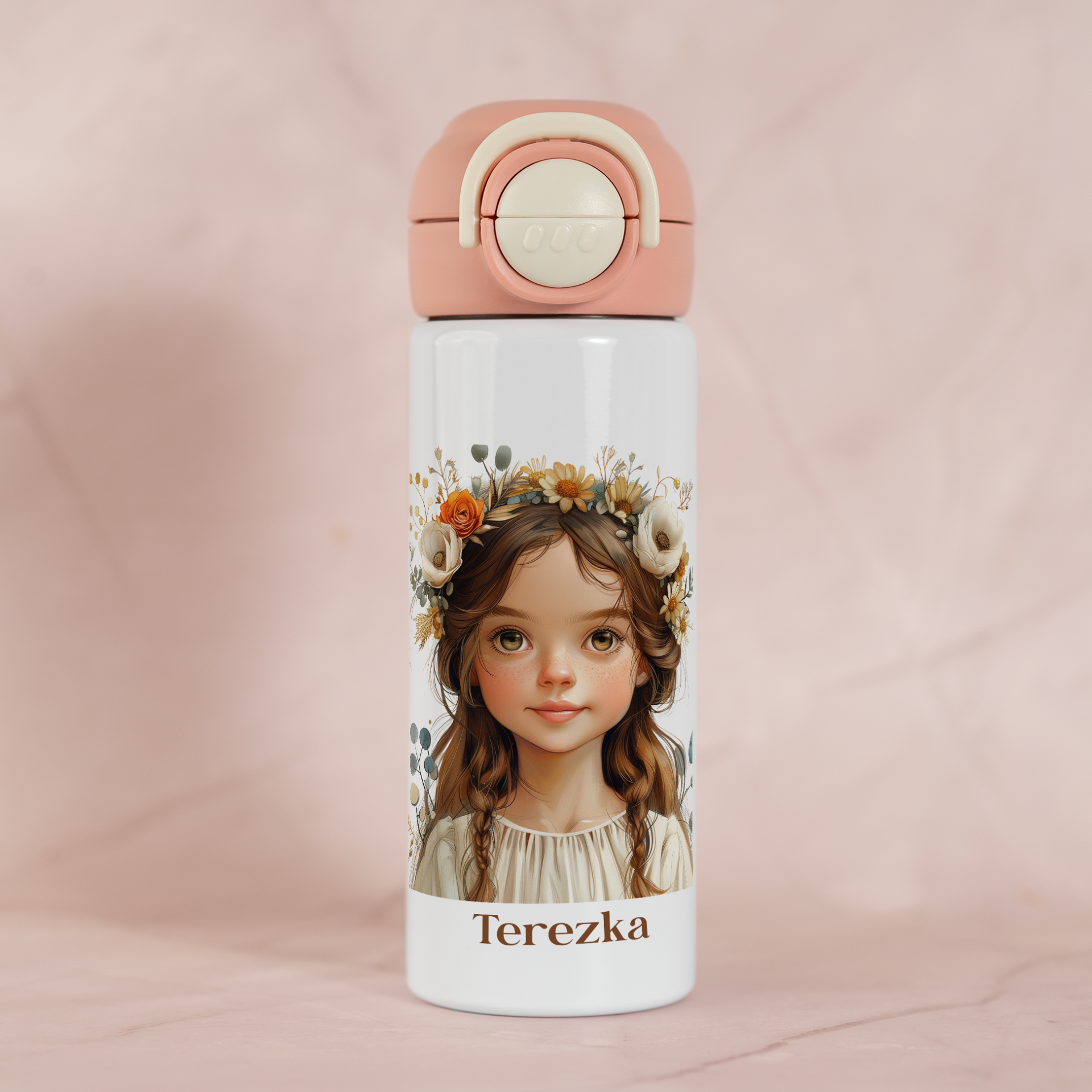DIEVČA nerezová termoska so slamkou (ružový vrchnák) s ľubovoľným menom pre deti