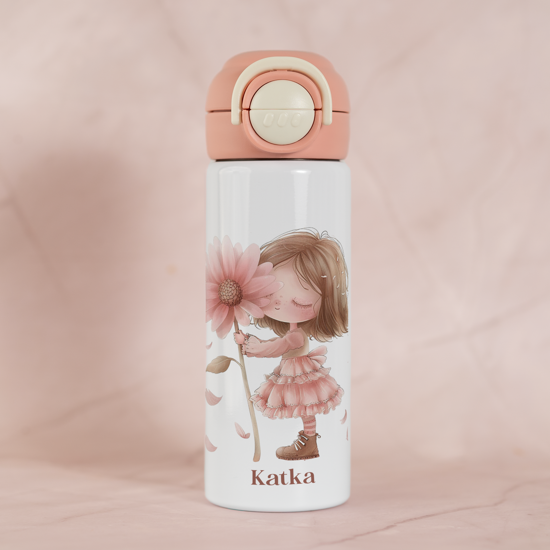 DIEVČA S KVETOM nerezová termoska so slamkou (ružový vrchnák) s ľubovoľným menom pre deti