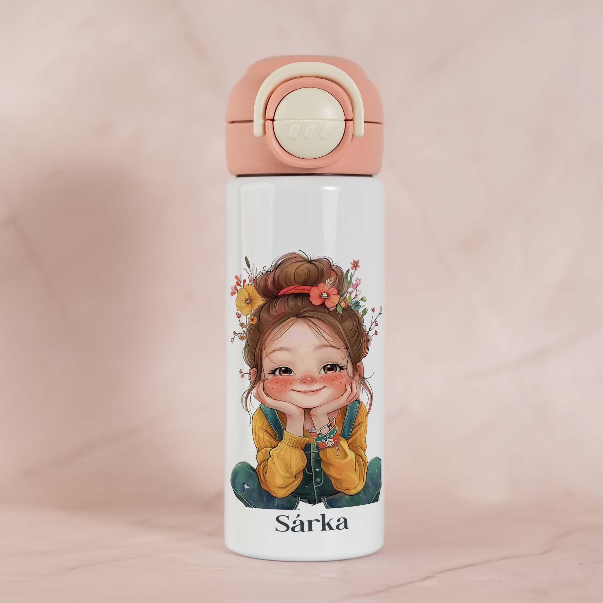 DIEVČATKO nerezová termoska so slamkou (ružový vrchnák) s ľubovoľným menom pre deti