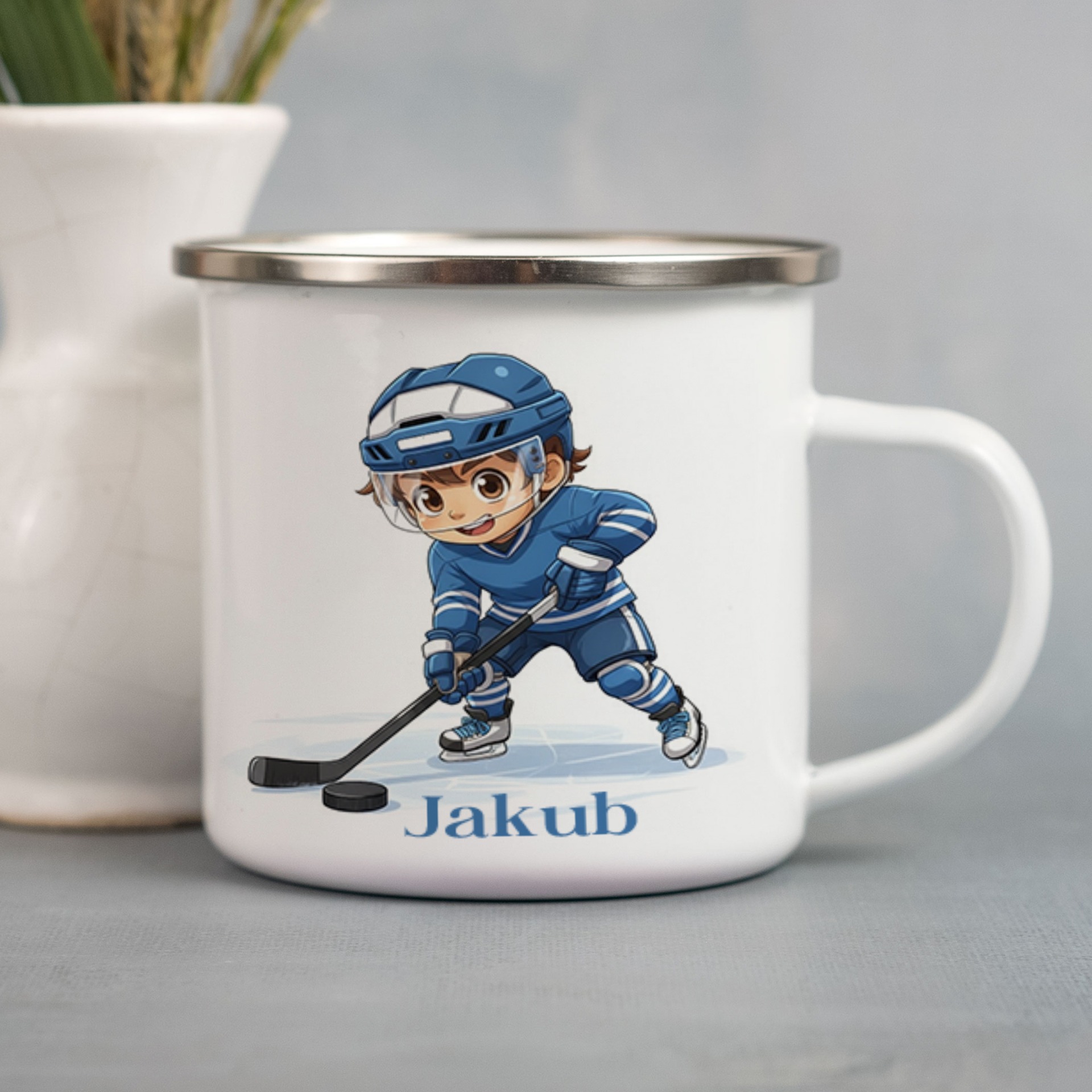 Biely smaltovaný kovový hrnček so strieborným lemom