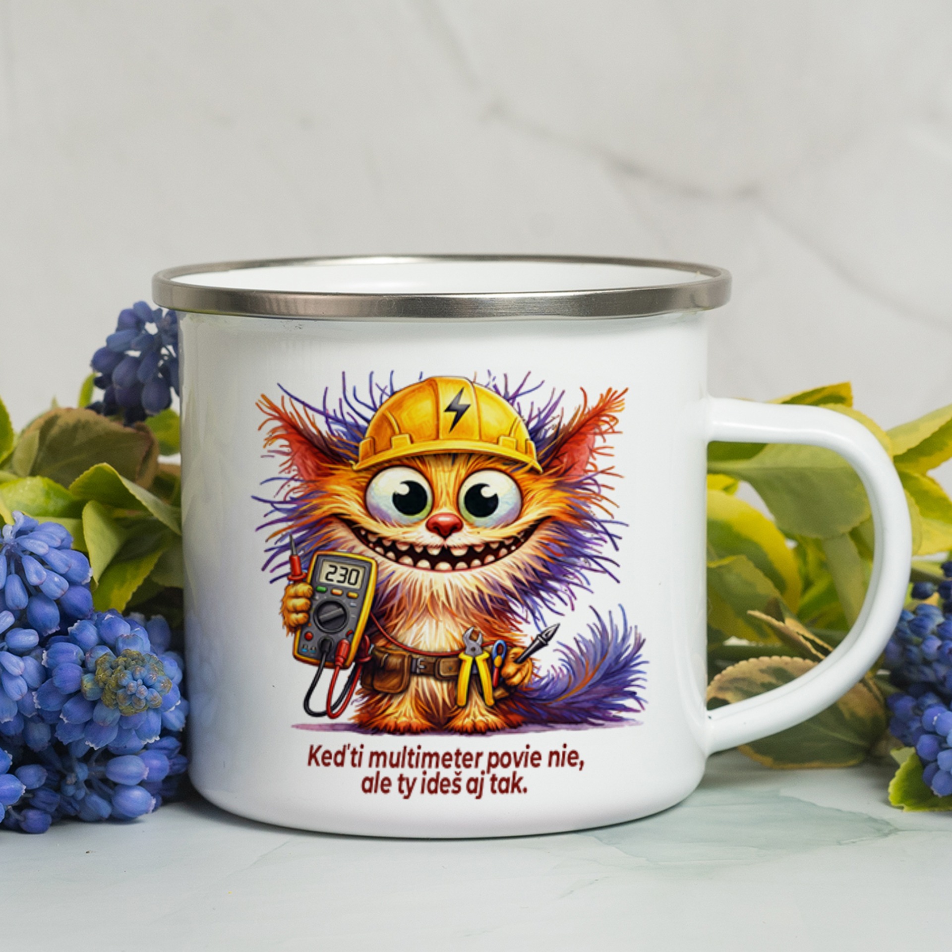 Biely smaltovaný hrnček so strieborným lemom
